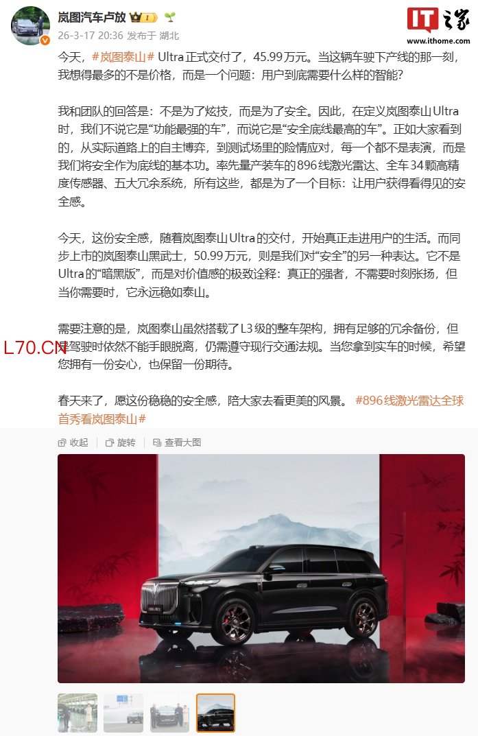 岚图汽车卢放:泰山虽搭载 L3 级整车架构有足够冗余备份,但驾驶时依然不能手眼脱离