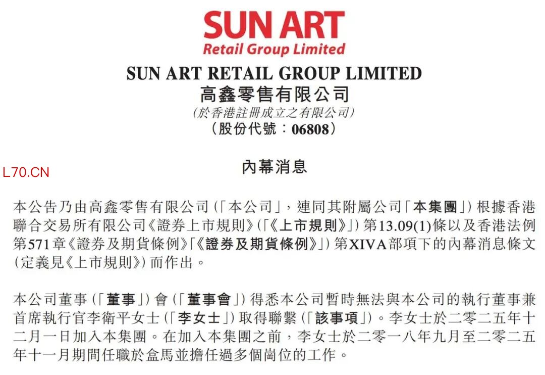 3月8日美股行情资讯平台,大润发母公司高鑫零售(06808)公告称,鉴于李卫平女士至今仍未能取得联络,其于一段长时间内在未请假情况下,未能履行其职责,董事会已议决免除李女士作为本公司执行董事之职务,自3月8日起即时生效。董事会主席华裕能已获委任为本公司首席执行官、由非执行董事调任为执行董事,并获委任为本公司之授权代表,自3月8日起生效。