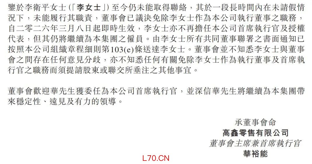 公告称,李女士不再担任本公司首席执行官及授权代表,但其仍将继续为本集团之雇员。