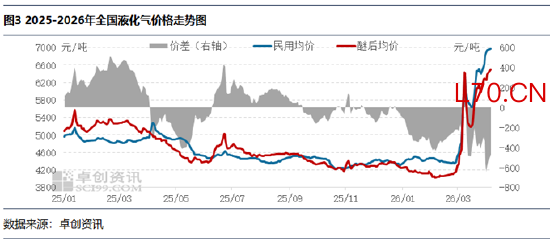 从价格表现来看,国内液化气市场呈现低库存与高价格相互强化的特征。上旬,资源趋紧、库存低位,叠加下游积极备货,推动价格快速攀升。中旬,价格高企抑制接货意愿,但库存累积有限,价格回落幅度不大。下旬,局势再度紧张,低库存环境下避险采购增加,价格再度走高。总体来看,低库存成为价格易涨难跌的重要支撑,而高价格又抑制了补库意愿,两者呈现动态平衡关系。