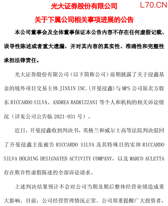 公告称,光大证券前期披露了关于浸鑫基金的境外项目交易主体JINXIN INC.(开曼浸鑫)与MPS公司原卖方股东RICCARDO SILVA、ANDREA RADRIZZANI等个人和机构的相关诉讼情况。近日,开曼浸鑫收到判决书,英格兰和威尔士高等法院判决驳回了开曼浸鑫主张被告RICCARDO SILVA及其特殊目的实体RICCARDO SILVA HOLDING DESIGNATED ACTIVITY COMPANY,以及MARCO AULETTA存在欺诈性虚假陈述的全部诉讼请求。上述判决结果预计不会对公司当期及期后整体经营业绩造成重大影响。目前,公司经营管理情况正常。